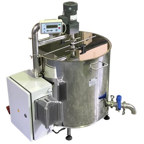 Есть автоматическая мешалка, регулятор скорости мешалки и реверс. Благодаря мешалке в автоматическом режиме не только облегчается производство сыра, но и открываются возможности изготовления элитных сыров, которые требуют длительного вымешивания молока и сыворотки при определенной скорости.